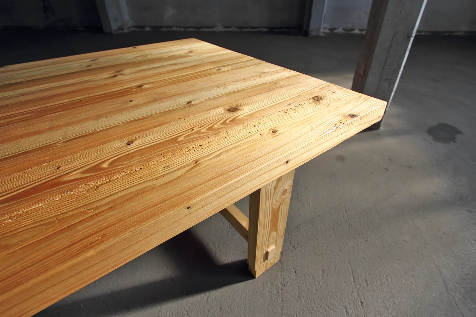 Klassischer Tischbau mit Querstreben und sichtbaren Verbindungen – ein Design, das dem Material gerecht wird.