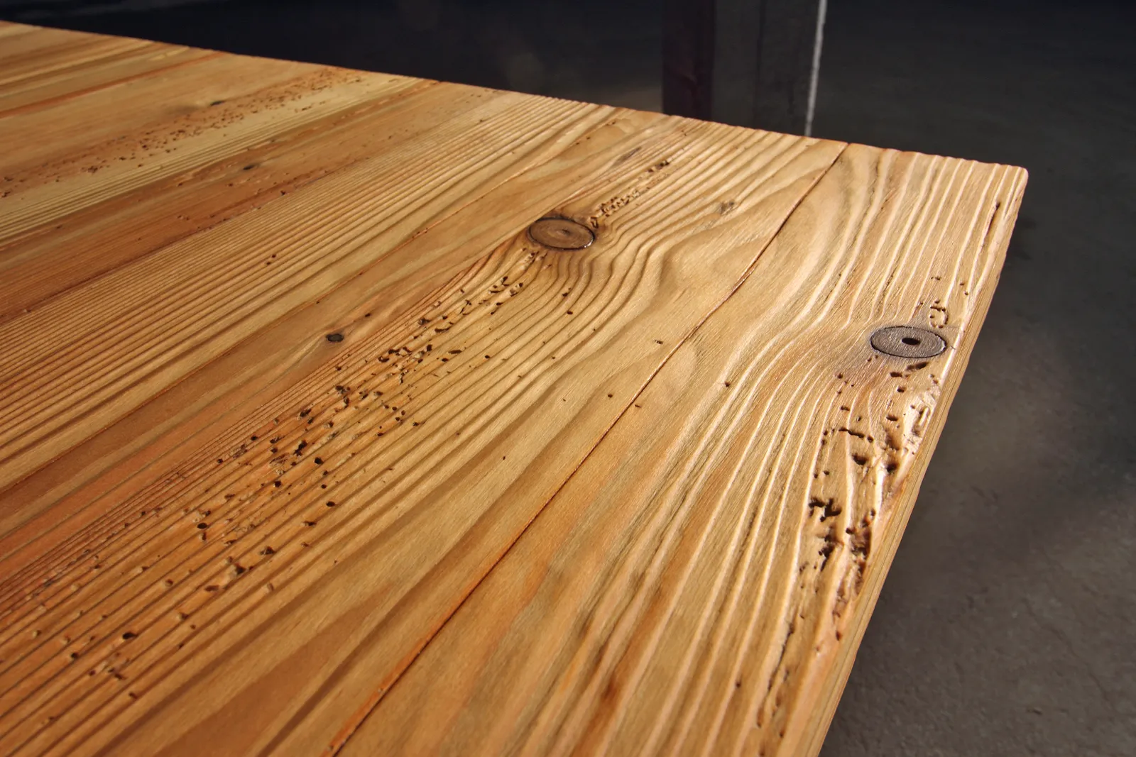Gebürstete Fichtenbalken mit deutlicher Maserung, sichtbaren Wurmlöchern und starker Haptik – jedes Stück ein Zeugnis der Vergangenheit.