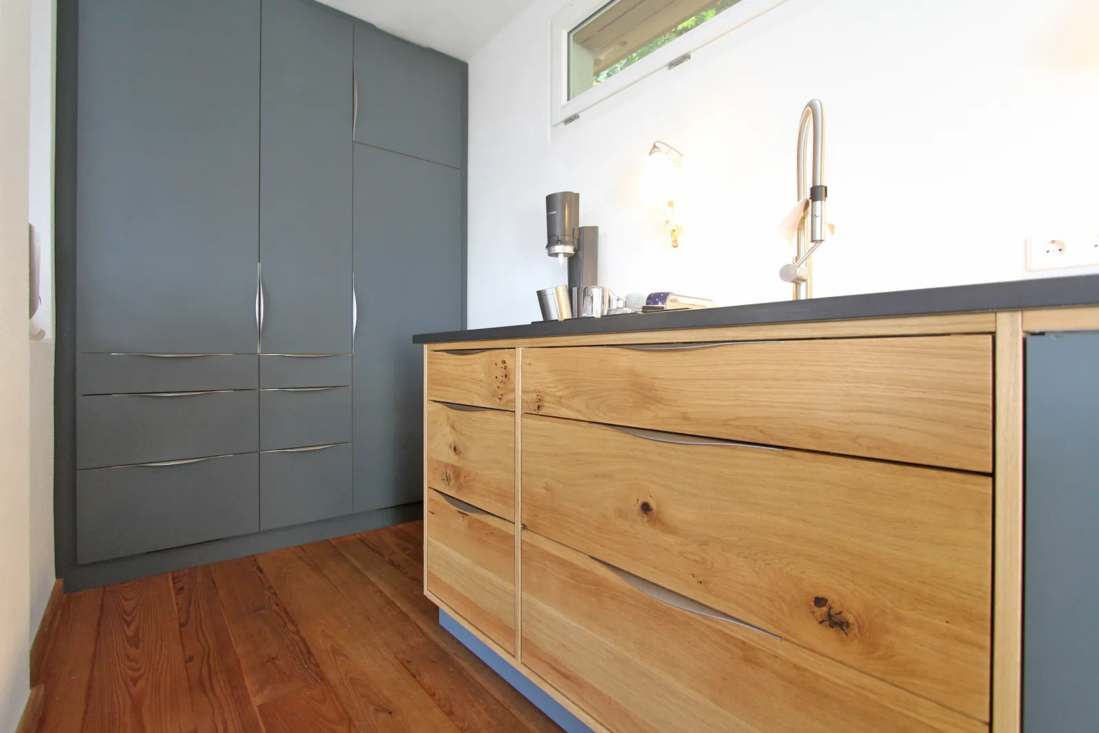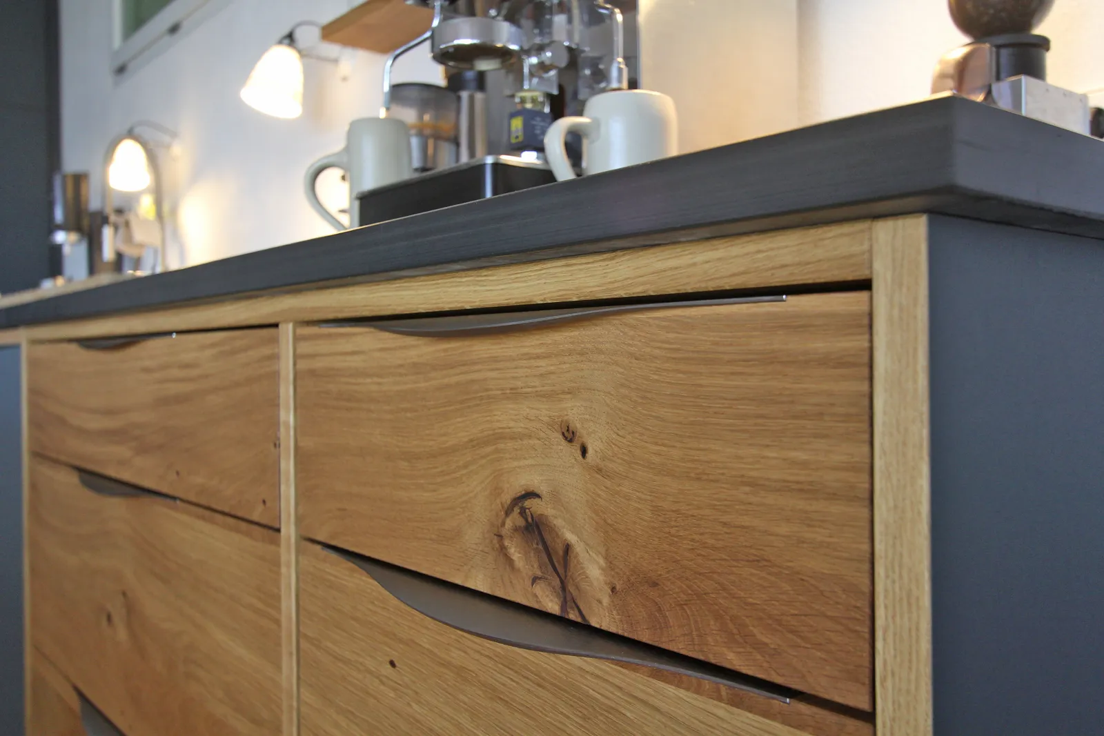 Die Massivholzfronten aus Eiche bringen Leben und Struktur in den Raum. Die feine Maserung, die fühlbare Oberfläche – all das macht diese Küche zu einem Ort, an dem man gern verweilt. Das matte Linoleum bildet dazu einen sanften Kontrast: samtig im Griff, dezent in der Wirkung, robust im Gebrauch.