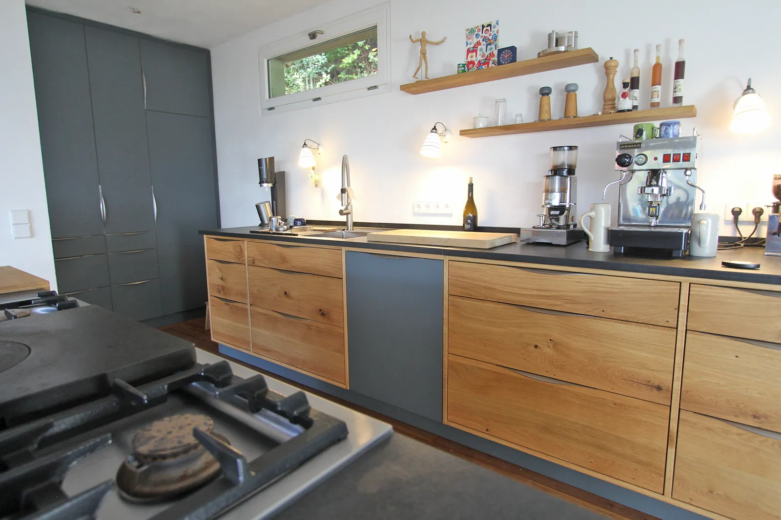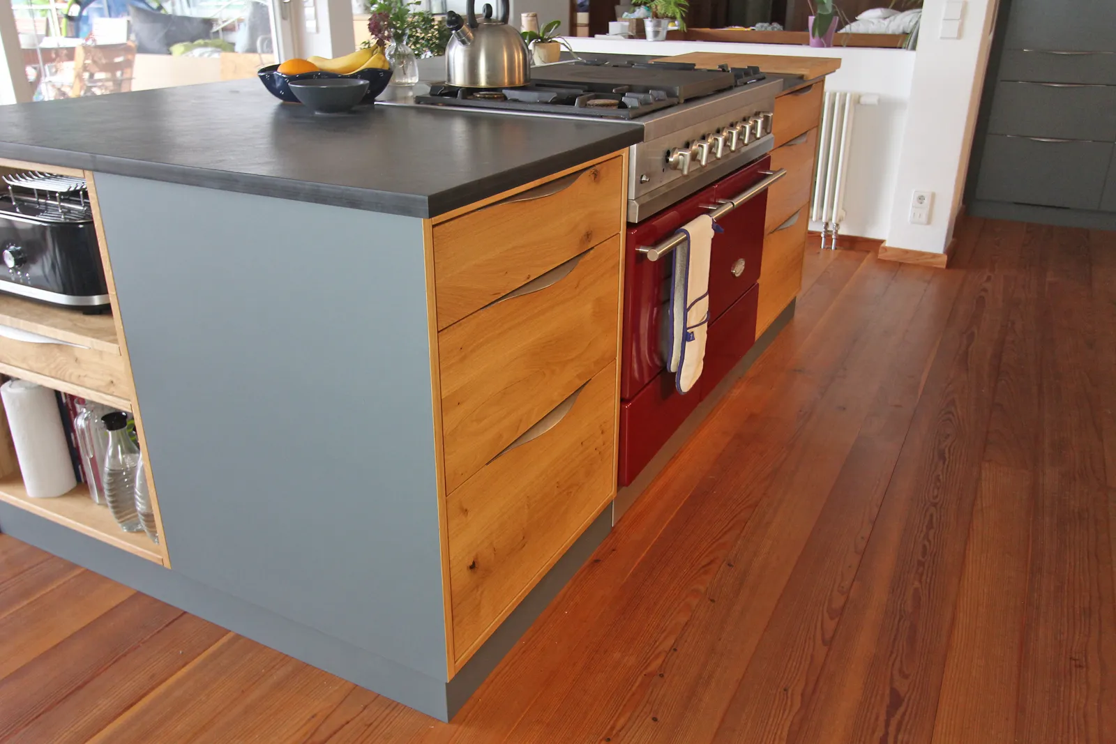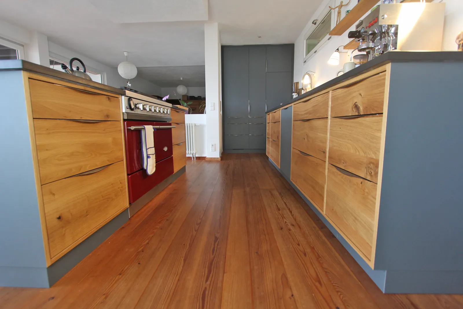 Diese Küche verbindet das Beste aus zwei Welten: die warme Ausstrahlung von massivem Eichenholz mit der ruhigen Eleganz von grauem Linoleum. Ein Zusammenspiel aus Naturmaterialien, das zeitlos schön wirkt – und im Alltag überzeugt.